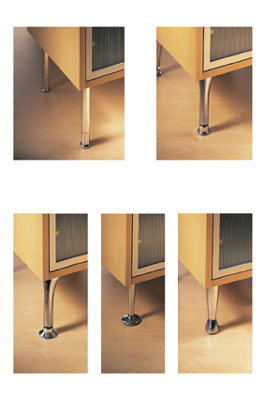 In jüngster Vergangenheit hat sich Häfele dem Thema Beinfreiheit am Möbel intensiv gewidmet und eine ansehnliche Kollektion von unterschiedlichsten Unterbausystemen in sein Programm aufgenommen. Vom höhenverstellbaren Designer-Möbelfuß im Materialmix Holz-Metall über Tischbeine und Kunststoffrollen bis zum rationell und kostengünstig einsetzbaren Standardfuß reicht heute das Angebot, das sich äußerst erfolgreich am Markt platziert hat. Mit dem kombinierbaren Möbelfußsystem erweitert Häfele nun erneut die Palette seiner Angebote in diesem Segment. | | Häfele macht’s möglich: Aus wenigen Teilen entstehen die unterschiedlichsten Möbelfüße. Sie werden mit Gewindeschraube oder mit Anschraubplatte am Möbel befestigt. |